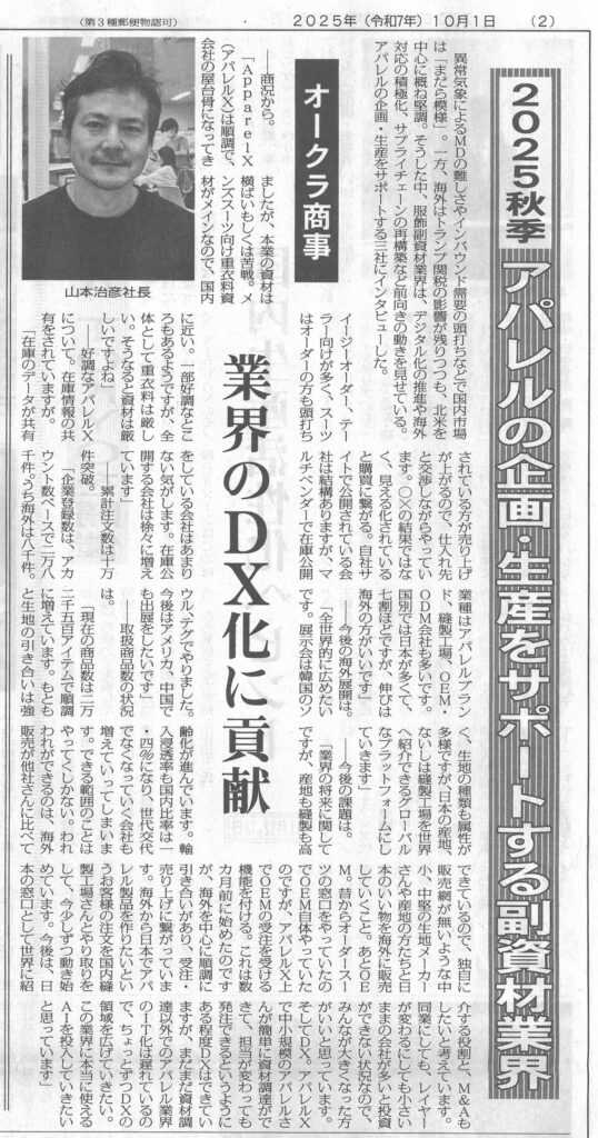 10月1日のアパレル工業新聞の2面【2025年秋季、アパレルの企画・生産をサポートする副資材業界】特集内で、弊社代表のインタビューが掲載されましたので、こちらで紹介致します。